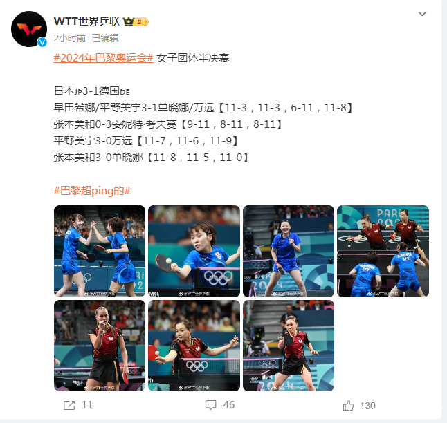 2024年巴黎奥运会三个单项比赛截至后,两个团体面容连忙开动。本次比赛,日本队由张本智和、户上隼辅、篠塚大登三东谈主构成,日本女乒由张本好意思和、早田希娜、平野好意思宇等三东谈主构成。