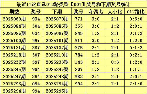 枚举三上期开出奖号为:994,其直选012路类型为001,历史上直选001号码已开出了343次,最近11期辨认开出奖号为:934、304、634、997、367、307、397、994、364、094、994。 前10次直选001组合出现之后,其下期奖号辨认为:771、353、845、911、275、784、143、207、983、994,其中奖号奇偶总比例为20:10,012路总比例为9:13:8,大小总比例为15:15。