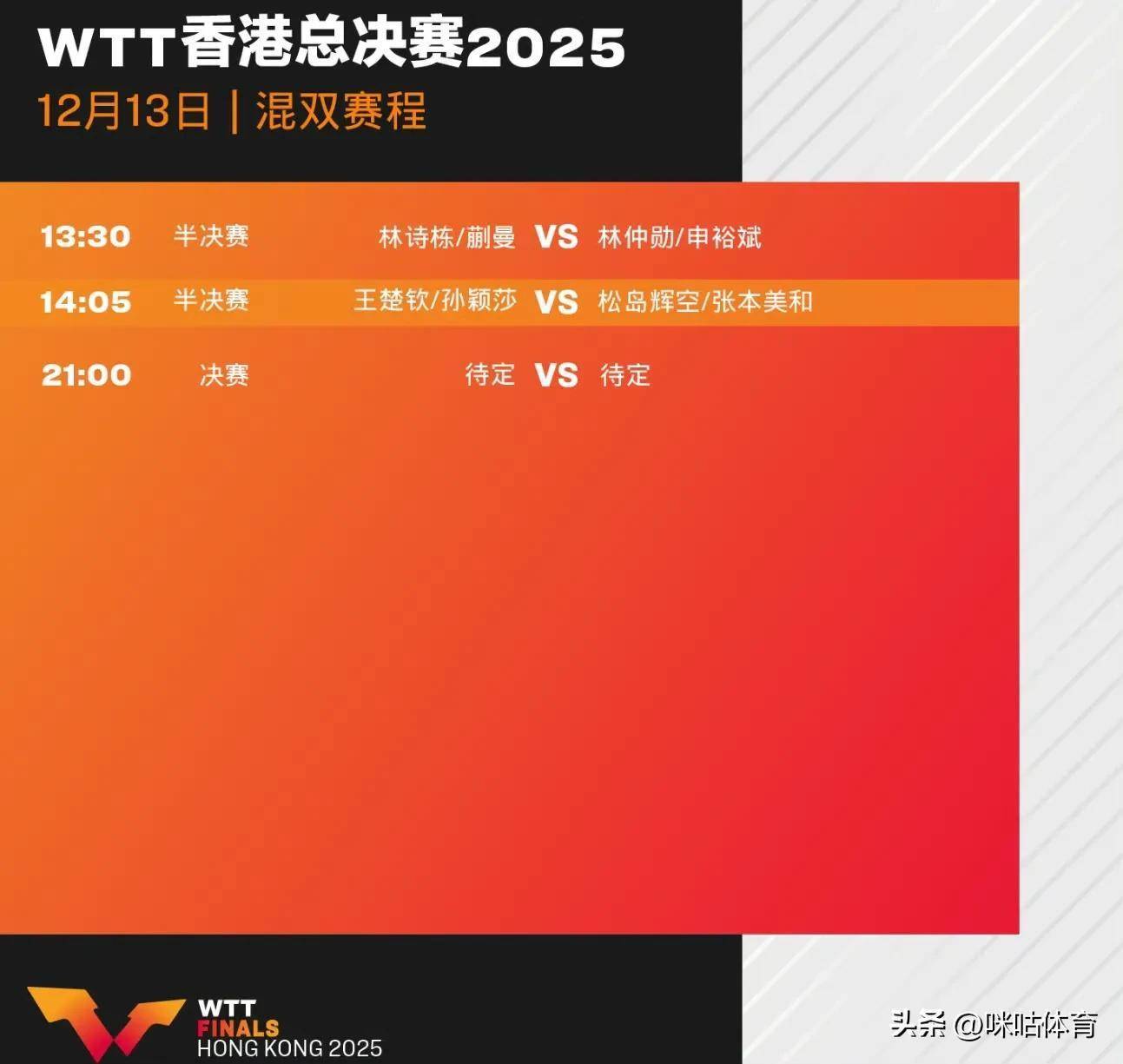 WTT香港总决赛12月13日赛程出炉!国乒主力出战,混双决赛压轴